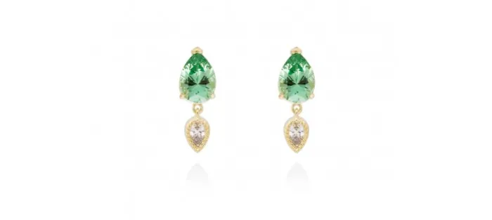 Pendientes de plata de primera ley (925) chapada en oro amarillo de 18kt, circonita blanca y piedra sintetica color esmeralda. (tamaño: 2,1 cm.)