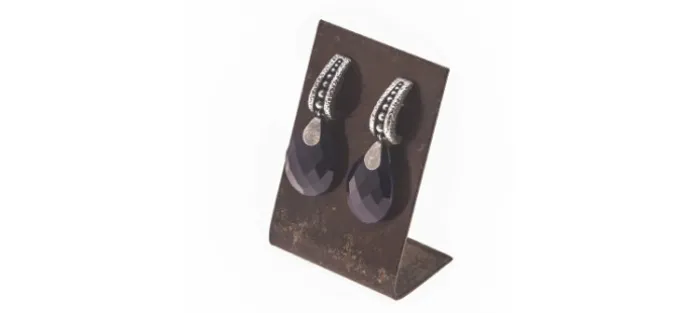 Pendientes largos (4 cm) de plata envejecida de primera ley (925) y calcedonias moradas. Perno del pendiente de oro amarillo de 18k.