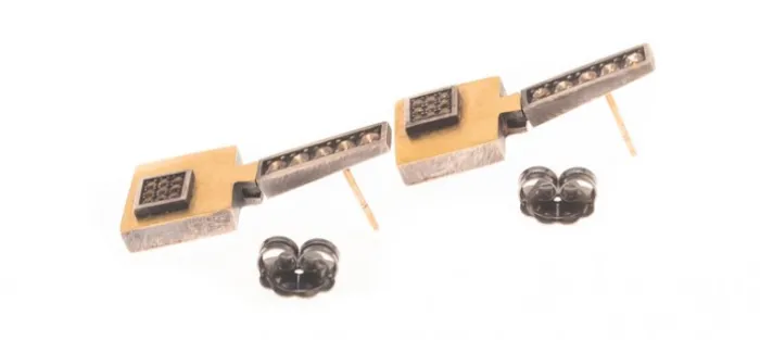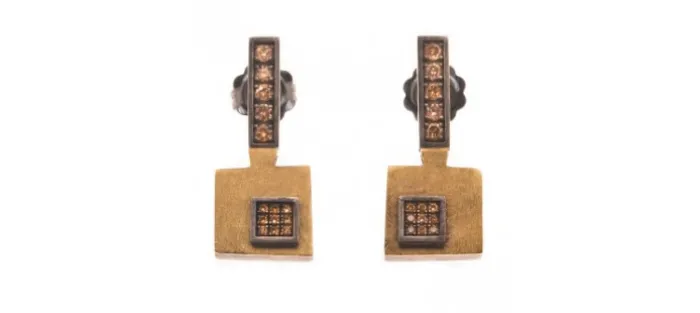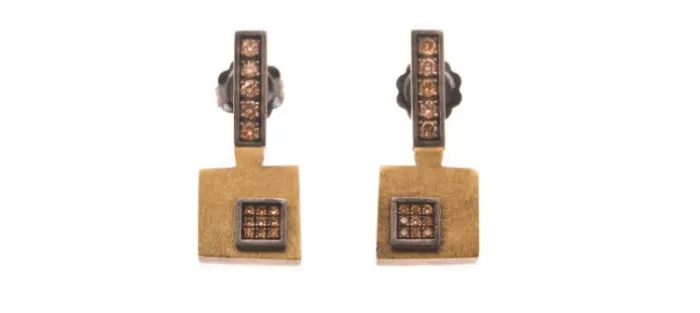 Pendiente cuadrado de plata envejecida de primera ley (925) y oro amarillo de 18 K. Perno tambien en oro amarillo de 18 K. Cada pendiente lleva engastado 9 diamantes marrones de 1,4 mm y 0,14 Quilates (Peso aproximado de todos los diamantes: 0,28 Quilates). La parte de arriba es una pieza rectangular de 20mm X 9mm con 5 diamantes coñac de 2,7mm y 0,40 Quilates.