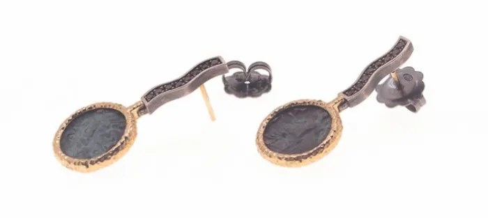 Pendiente de plata envejecida de primera ley (925), broce y oro amarillo de 18 Quilates. Perno (pincho trasero) también en oro amarillo de 18 Quilates. Llevan un total de 16 diamantes negros con un peso aproximado de 0,32 Cts.
