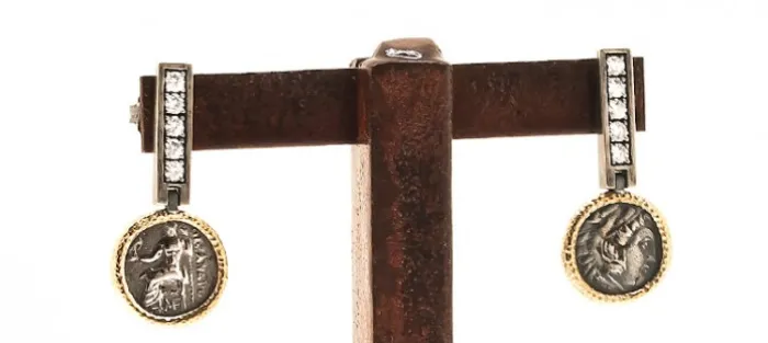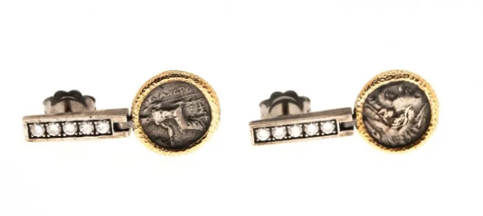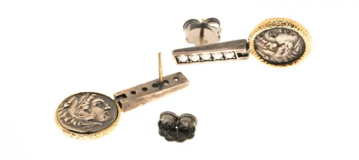 Pendiente de plata envejecida de primera ley (925) y oro amarillo de 18 Quilates. Perno (pincho trasero) también en oro amarillo de 18 Quilates. CInco Zirconitas blancas.