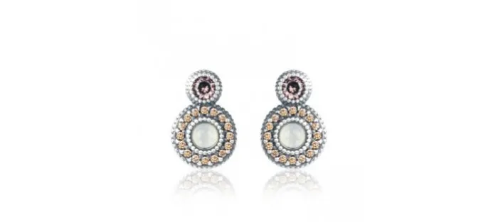Pendientes de plata envejecida de 13×8 mm con cabujón liso de 3 mm de calcedonia rodeado de circonitas champangne y brown talla brillante.