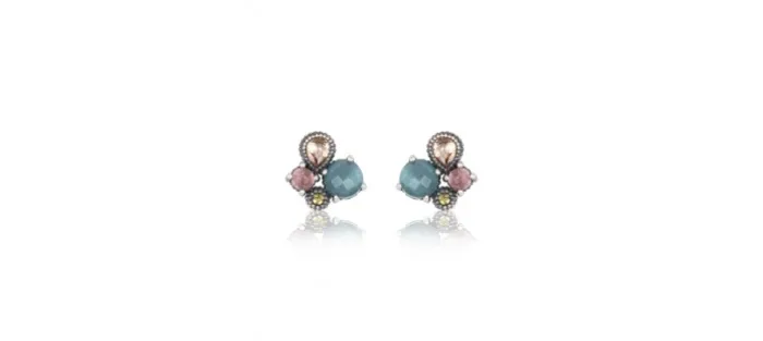 Pendiente de plata de ley 925 con acabado envejecido y lo componen un cabujón facetado de símil ópalo, un cabujón liso de turmalina rosa, una circonita peridoto talla brillante y una champagne talla lágrima.