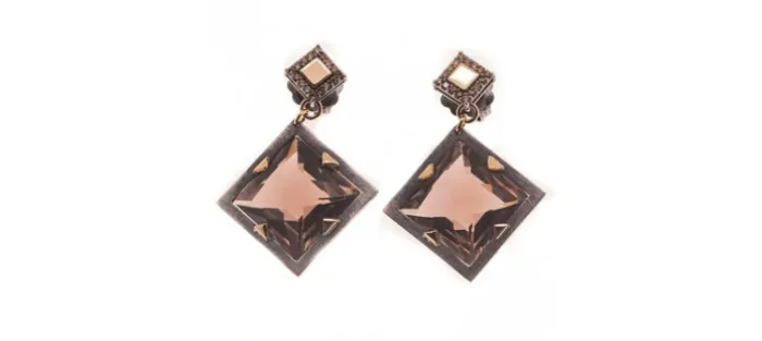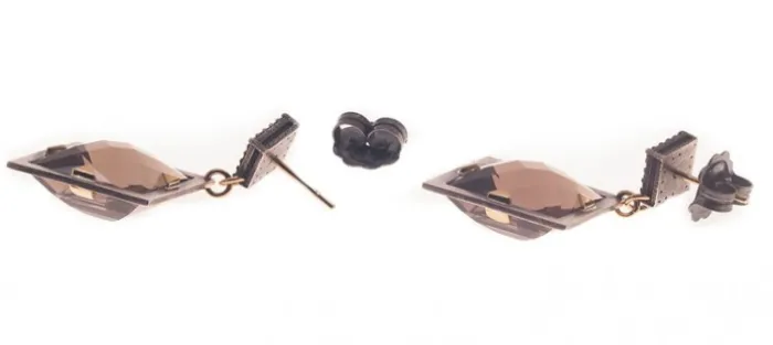 Pendientes de plata envejecida de primera ley (925), oro amarillo de 18 Quilates, diamantes color coñac y cuarzo fumé. Peso aproximado de los diamantes 0.40 Cts.
