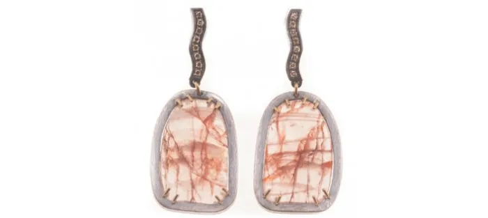 Pendiente de plata envejecida de primera ley (925), oro amarillo de 18 Quilates y Agata transparante con vetas marrones. Perno (pincho trasero) también en oro amarillo de 18 Quilates. Llevan un total de 16 diamantes color coñac con un peso aproximado de 0,23 Cts.