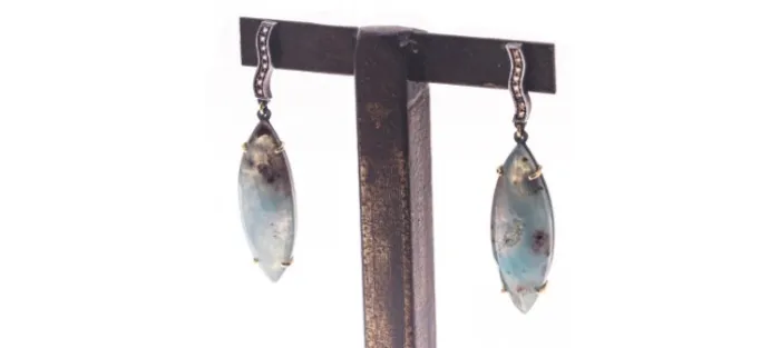 Pendientes sinuosos de plata envejecida de primera ley (925) y oro amarillo de 18 Quilates. Cada pendiente lleva 8 diamantes coñac de 1,4mm (Peso total de los diamantes 0,28 Quilates) y una Aquaprasa natural.