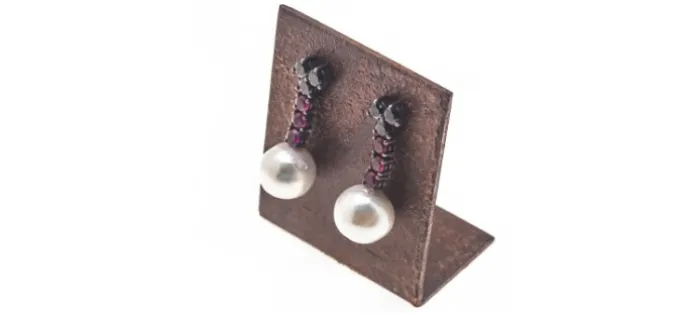 Pendientes con perla cultivada, espinelas y rubíes sintéticos. Base de plata envejecida (925).