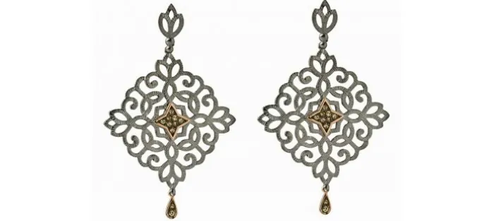 Pendientes de plata con baño de rutenio, motivo central en oro rosa y diamantes.