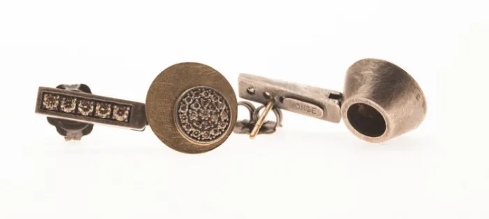 Pendiente de plata envejecida de primera ley (925) y oro amarillo de 18 Quilates. Perno también en oro amarillo de 18 Quilates.