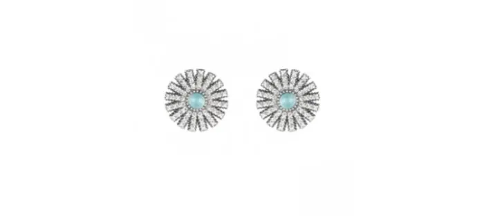 La combinación más refrescante de la colección Capri de Sunfield es la de estos pendientes de botón en plata de ley 925 donde a un cabujón de 3 mm en color ópalo azul lo rodean un círculo de circonitas blancas de 1 mm en talla brillante.