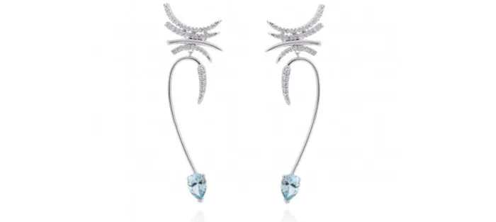 Pendientes de plata de primera ley (925) con baño de rodio, circonita blanca y piedra sintetica color aguamarina. (dimensiones de la pieza: 7,5 x 2,5 cm.)