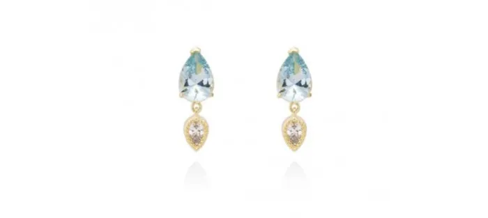 Pendientes de plata de primera ley (925) chapada en oro amarillo de 18kt, circonita blanca y piedra sintetica color aguamarina. (tamaño: 2,1 cm.)