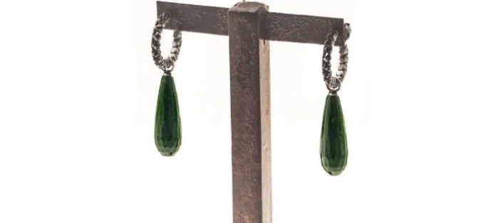 Pendientes de aro (21mm de diámetro) de plata envejecida de primera ley (925), espinelas negras y ágatas verdes.