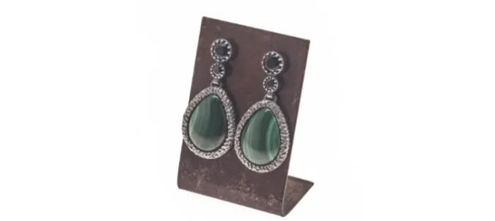 Pendientes realizados con plata envejecida de primera ley (925), circonitas negras y Malaquita. Perno en oro amarillo de 18 Quilates.
