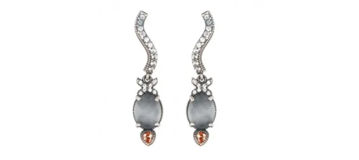 Pendientes de plata de ley 925, circonitas cava en una tira y blancas en X sobre un elegante cabujón facetado en cuarzo gris culminando todo el conjunto con una circonita cava en forma de gota en su parte inferior.
