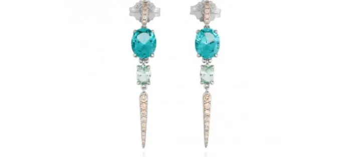 Pendientes de plata de primera ley (925) con baño de rodio, circonita coñac, piedra sintetica color paraiba y piedra sintetica color «verde agua». (tamaño: 5 cm.)