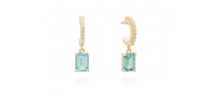 Pendientes de plata de primera ley (925) chapada en oro amarillo de 18kt con circonita blanca y piedra sintetica color paraiba. (tamaño: 2 cm.)