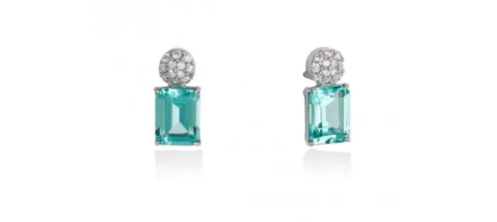 Pendientes de plata de primera ley (925) con baño de rodio, circonita blanca y piedra sintetica color paraiba. Largura 1,5 cm.