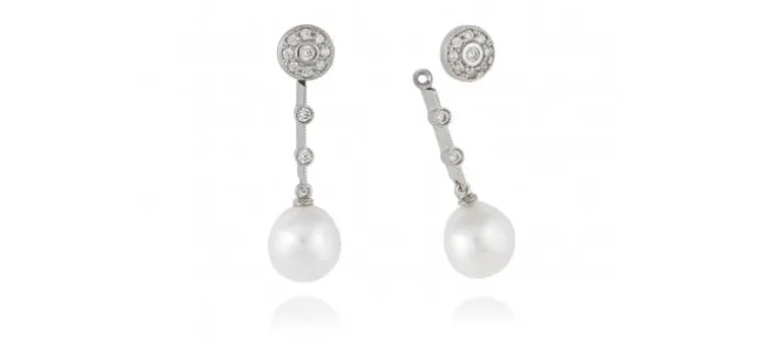 Pendientes de plata de primera ley (925) con baño de rodio, circonita blanca y perlas cultivadas. (largo: 3,5 cm.)