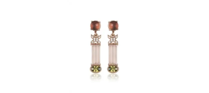 Pendientes fabricado en plata de ley 925 bañada en oro rosa de 18 k, turmalina rosa, cuarzo rosa, circonita de color peridoto y blancas.