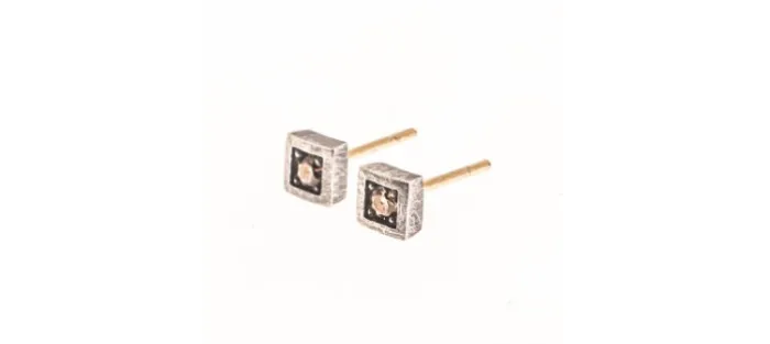 Pendientes de plata envejecida de primera ley (925) y dos diamantes brown de 3mm con un peso aproximado de 0,22 Quilates. Perno en oro amarillo de l8 K.
