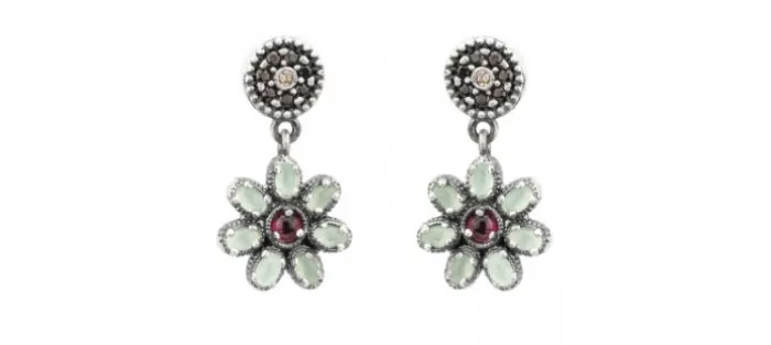 Pendientes de plata. Engastado con piedras semipreciosas. Piedra granate, calcedonia verde. Diámetro pendiente 14mm. Diseño elaborado en España 100% artesanal.