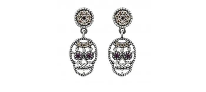 Pendientes de plata Calavera Mejicana. Engastado con piedras semipreciosas circonitas. Medidas de 34x17mm.