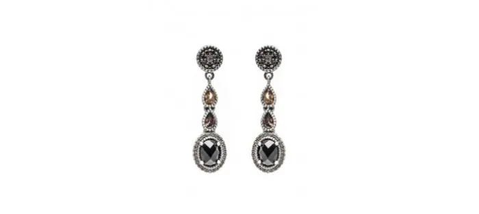 Pendientes de plata. Engastado con piedras semipreciosas. Piedra central ojo de gato rosa 6x8mm, orla circonita cava y peras circonitas cava y brown. Largo pendiente 28x11mm.