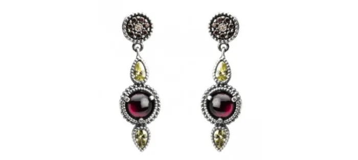 Pendientes de plata. Engastado con piedras semipreciosas. Piedra central granate y circonitas verde, brown, cava. Largo 25mm.