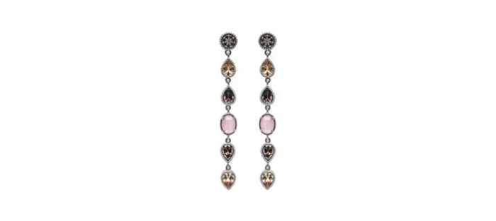 Pendientes de plata. Engastado con piedras semipreciosas. Piedra central ojo de gato rosa 6x8mm, peras circonitas brown y cava. Largo pendiente 58mm.