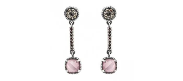 Pendientes de plata. Engastado con piedras semipreciosas. Piedra central ojo de gato rosa, circonitas cava, brown. Largo 30mm.