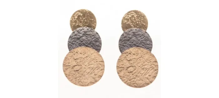 Pendiente de plata envejecida de primera ley (925) y oro amarillo texturado mate de 18 Quilates. Perno también en oro amarillo de 18 Quilates.