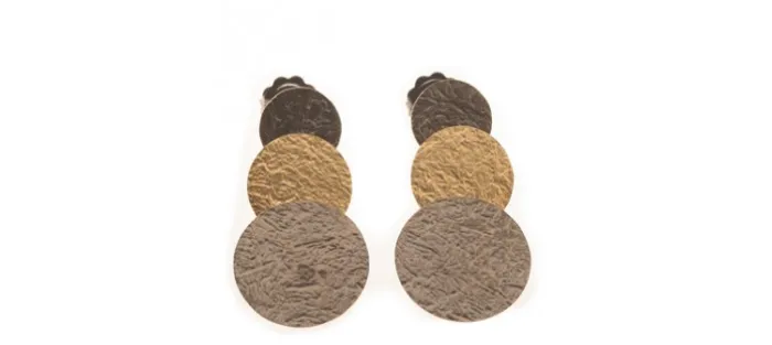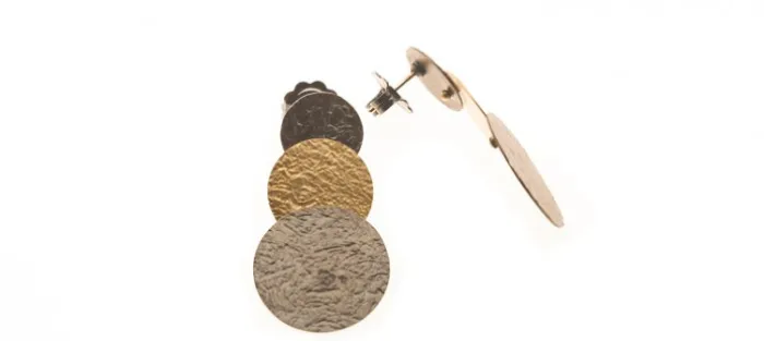 Pendiente de plata envejecida de primera ley (925) y oro amarillo texturado mate de 18 Quilates. Perno también en oro amarillo de 18 Quilates.