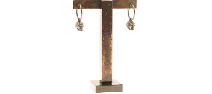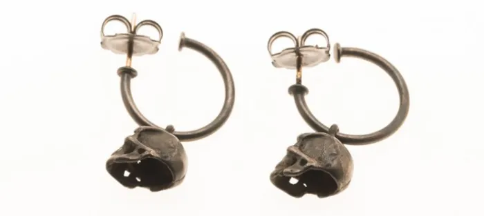 Se trata de un aro de 17 mm de diámetro del que cuelga una calavera con dos diamantes coñac de 2,1mm y 0,08 Quilates (Peso total de los brillantes 0,16 Quilates)