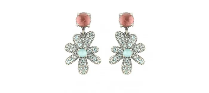 Pendientes de plata de ley 925 con turmalina rosa, símil ópalo azul y circonitas.