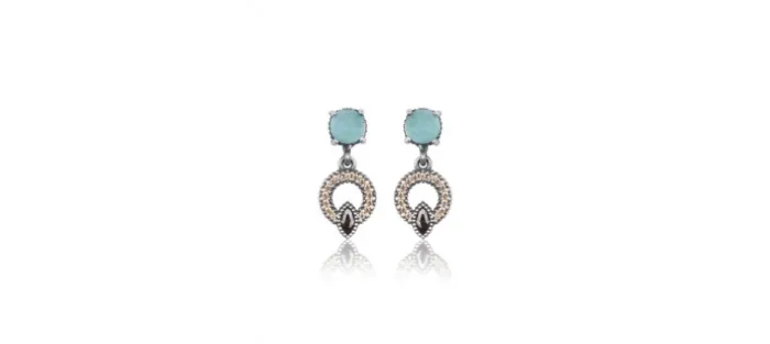 Pendientes fabricados en plata de ley 925 con acabado envejecido,simil opalo azul y circonitas.
