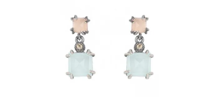 Pendientes con movimiento de 2,2 cm por 0,9 cm, de plata envejecida con circonitas de color champagne, un cabujón de cuarzo rosa talla pirámide, un cabujón de calcedonia talla pirámide y cierre con presión mariposa.