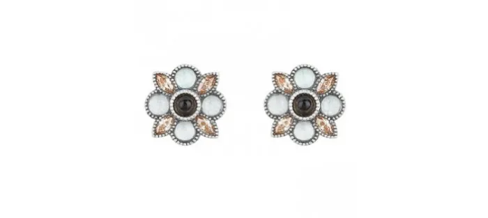 Pendientes de plata envejecida, de 1,5 cm de diámetro, con circonitas de color champagne, 4 cabujones lisos de calcedonia de 3 mm, 1 cabujón liso de cuarzo fumé de 3 mm y cierre con presión de mariposa de 1 cm.