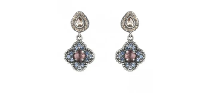 Pendientes SUNFIELD con movimiento, de 2,1 cm por 1,3 cm, de plata envejecida con turmalina rosa y circonitas. Cierre con presión mariposa de 1 cm.
