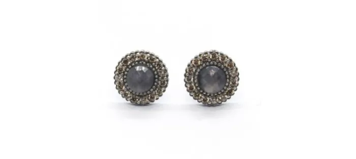Pendientes de plata envejecida con cabujón facetado central de cuarzo rodeado de circonitas champagne talla brillante.