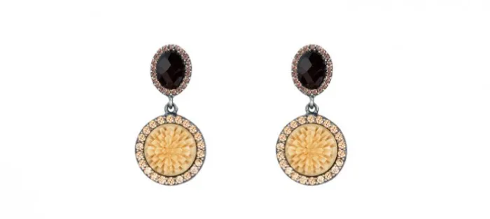 Pendiente de plata envejecida de primera ley (925). Hueso, Zirconitas coñac y Cuarzo fumé.