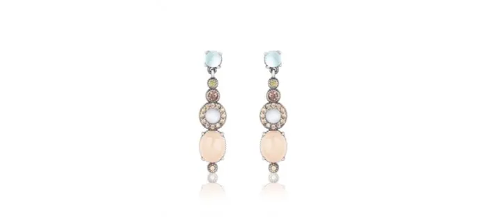 Pendientes fabricados en plata de ley 925 con acabado envejecido de 38 mm de largo. De arriba a abajo lo componen un cabujón facetado de símil aguamarina, una circonita peridoto, una brown, un circulo de circonitas champagne todas talla brillante y por último un cabujón liso oval de cuarzo rosa con una circonita champagne talla brillante.
