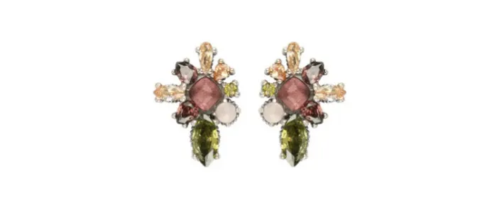 Pendientes de plata de ley 925 con acabado envejecido. Están realizados con un corazón de turmalina rosa talla princesa acompañado de un cabujón liso en cuarzo rosa, y circonitas de diferentes tallas y tamaño combinando las tonalidades del cava y el vino, y rematadas por una circonita en forma de gota color verde peridoto.