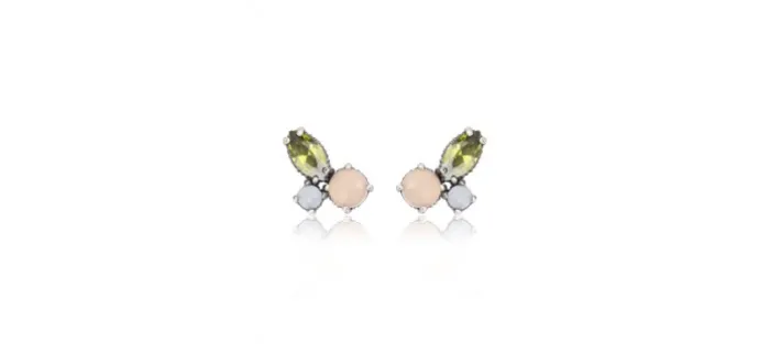 Pendientes de plata de ley 925 con acabado envejecido y lo componen un cabujón facetado de cuarzo rosa, un cabujón liso de calcedonia y una circonita peridoto talla marquise.