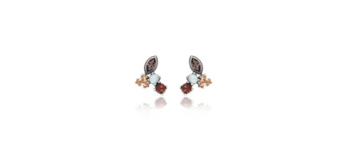Pendiente de plata de ley 925 con acabado envejecido y lo componen un cabujón liso de jaspe, otro símil ópalo y una circonita champagne talla triángulo y una circonita brown talla marquise.