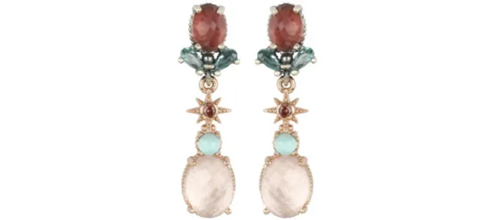 Pendientes de plata de ley 925 con baño de oro rosa de 24 kt, cuarzo rosa, turmalina rosa, símil ópalo azul y circonitas.