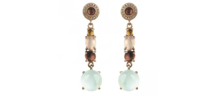 Pendientes SUNFIELD con movimiento, de 3,8 cm por 0,5 cm, de plata con baño de oro rosa de 18 kt, con cuarzo rosa, turmalina rosa, calcedonia y circonitas. Cierre con presión mariposa de 1 cm.