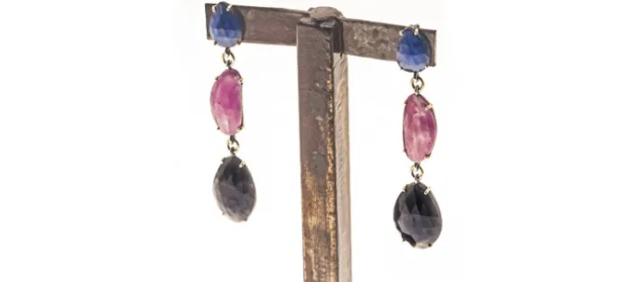 Pendientes de plata de envejecida de primera ley (925), oro amarillo de 18k y multizafiro. (6,3 cm de lagos).