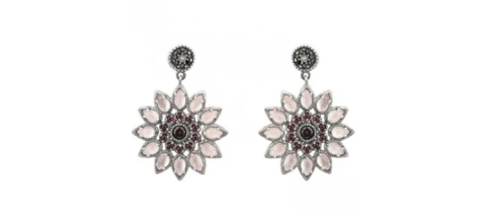 Pendientes de plata. Engastado con piedras semipreciosas. Piedra ojo de gato rosa, granate y circonita brown. Diámetro pendiente 28mm. Diseño elaborado en España 100% artesanal.