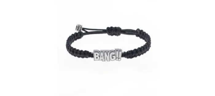 Pulsera texto BANG!! de plata envejecida de primera ley (925) y nylon náutico (muy resistente). Cierre mediante nudo corredizo ajustable de medida.